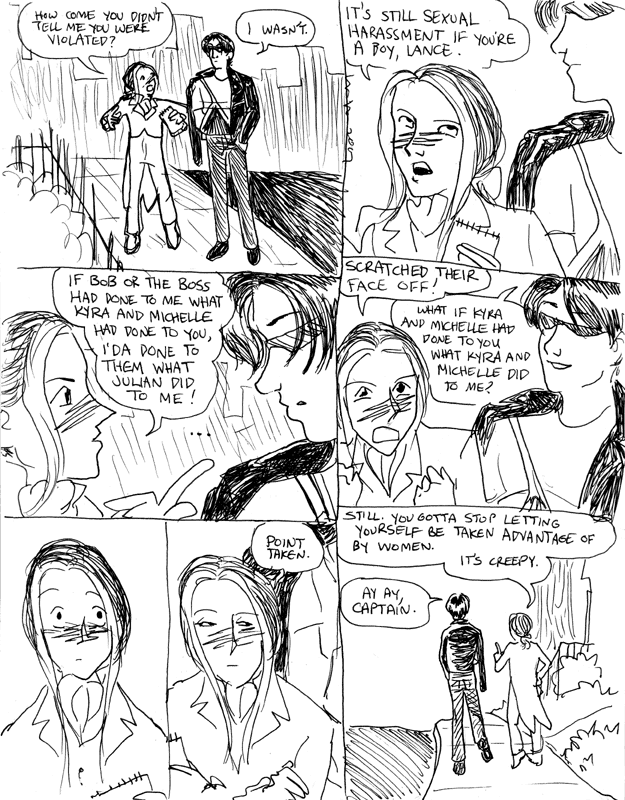 ESKIMO: It’s still sexual harassment if you’re a boy, Lance. If Bob or the Boss had done to me what Kyra and Michelle had done to you, I’da done to them what Julian did to me! (off Lance’s inquisitive look) Scratched their face off!