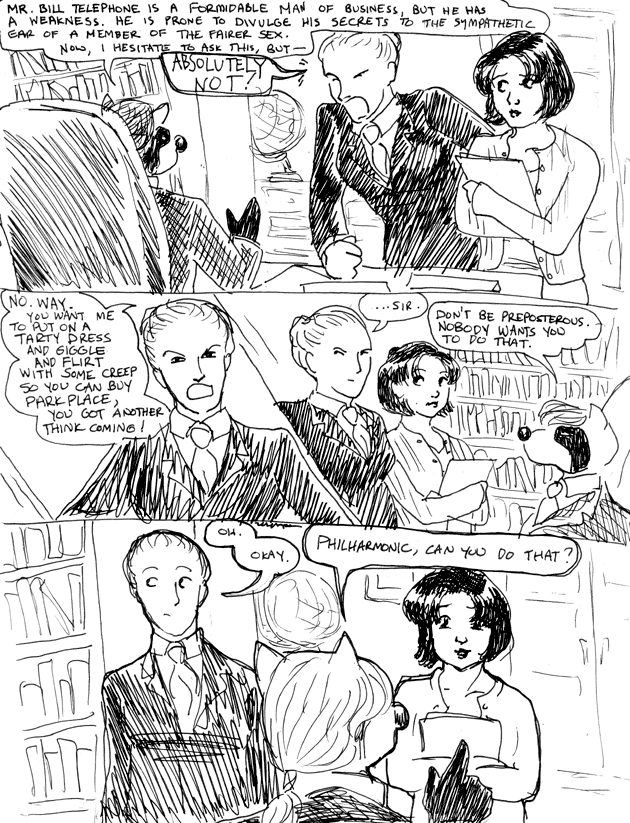 MANDRAKE: Mr. Bill Telephone is a formidable man of business, but he has a weakness. He is prone to divulge his secrets to the sympathetic ear of a member of the fairer sex. Now, I hesitate to ask this, but–