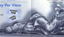 On the front of the pamphlet, The Cox Cartoon Technician (or "Creepy") is pictured lying langorously on a digital cable, fingering himself lovingly and staring at us with an expression of glazed and imbecile contentment. He doesn't appear to be working. He's certainly not installing any cable. He's lounging in a position which doesn't really suggest that he's proclaiming the advantages of "Digital picture and sound on your existing TV!" or telling us to "Enjoy over 200 channel choices!" More than anything, one suspects that he is saying "Come and get it!"
